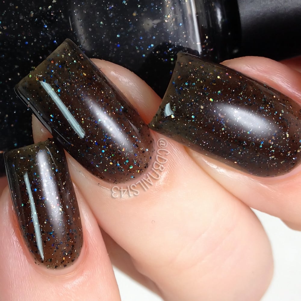 Back for a limited time! Black Cats Love Holo is a black jelly packed with black galaxy holo glitters, and silver and black holo micro glitters. Only available through the month of October!