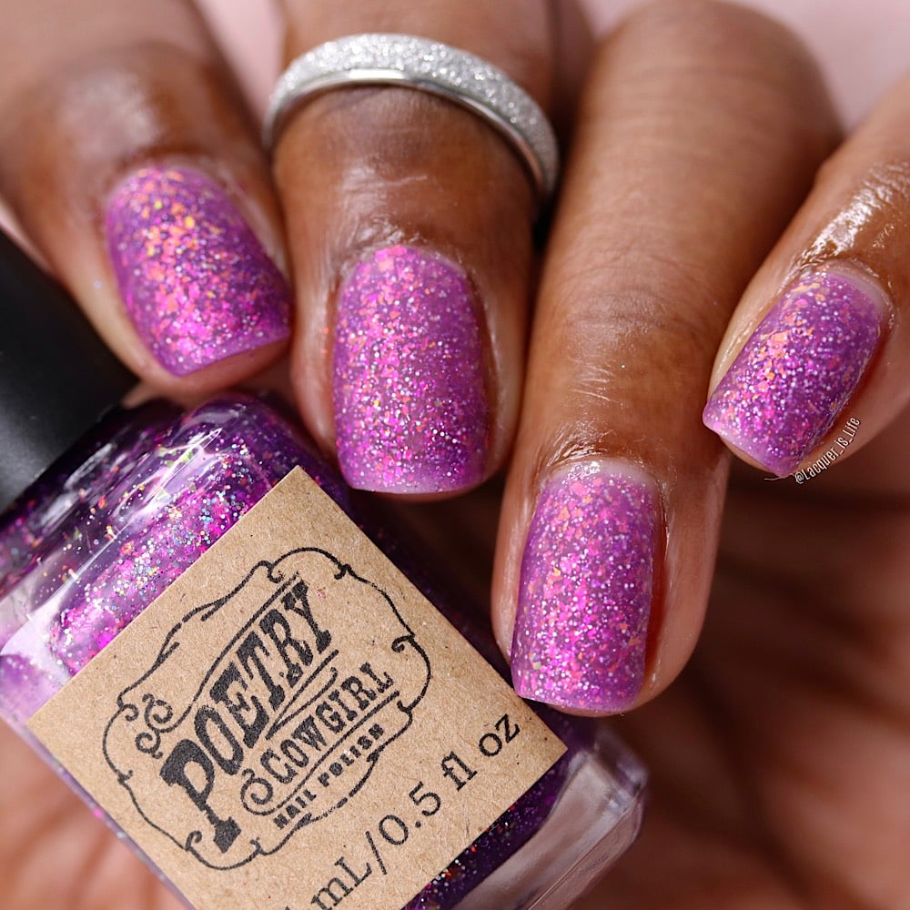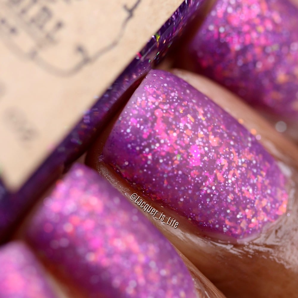 Ravenswood is a purple jelly base packed with pink-green-gold iridescent color shifting flakies, silver holo glitters, and lavender micro glitters.