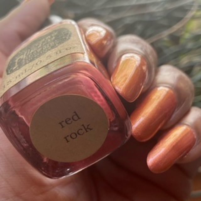 A vibrant coral base packed with copper-orange-gold shifting shimmer.