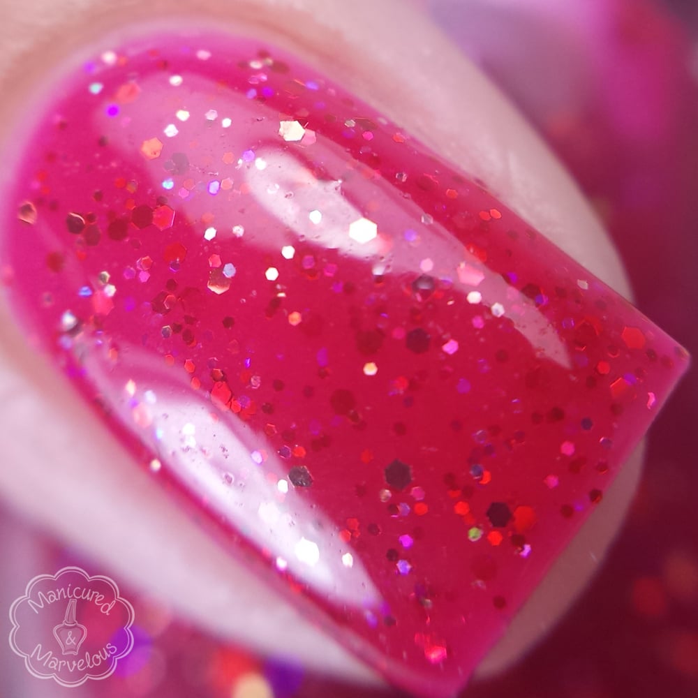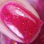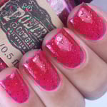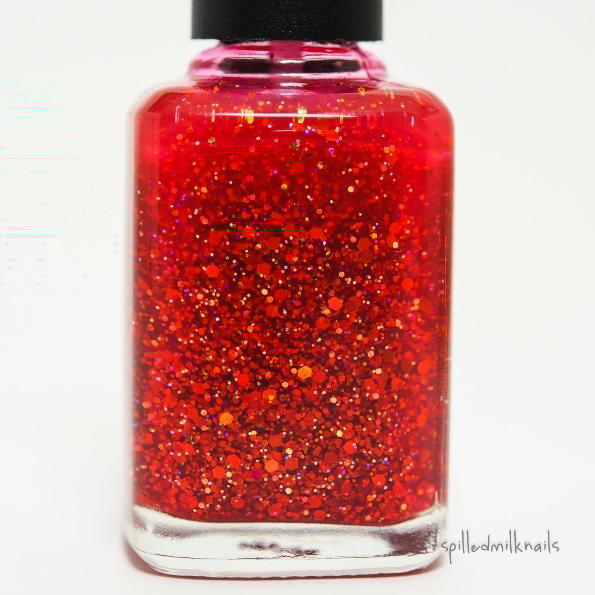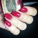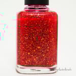 Santa's New Suit is a full coverage glitter packed with red holo, iridescent, gold, and gold holo glitters in a red tinted base. The perfect red glitter polish!