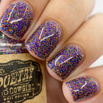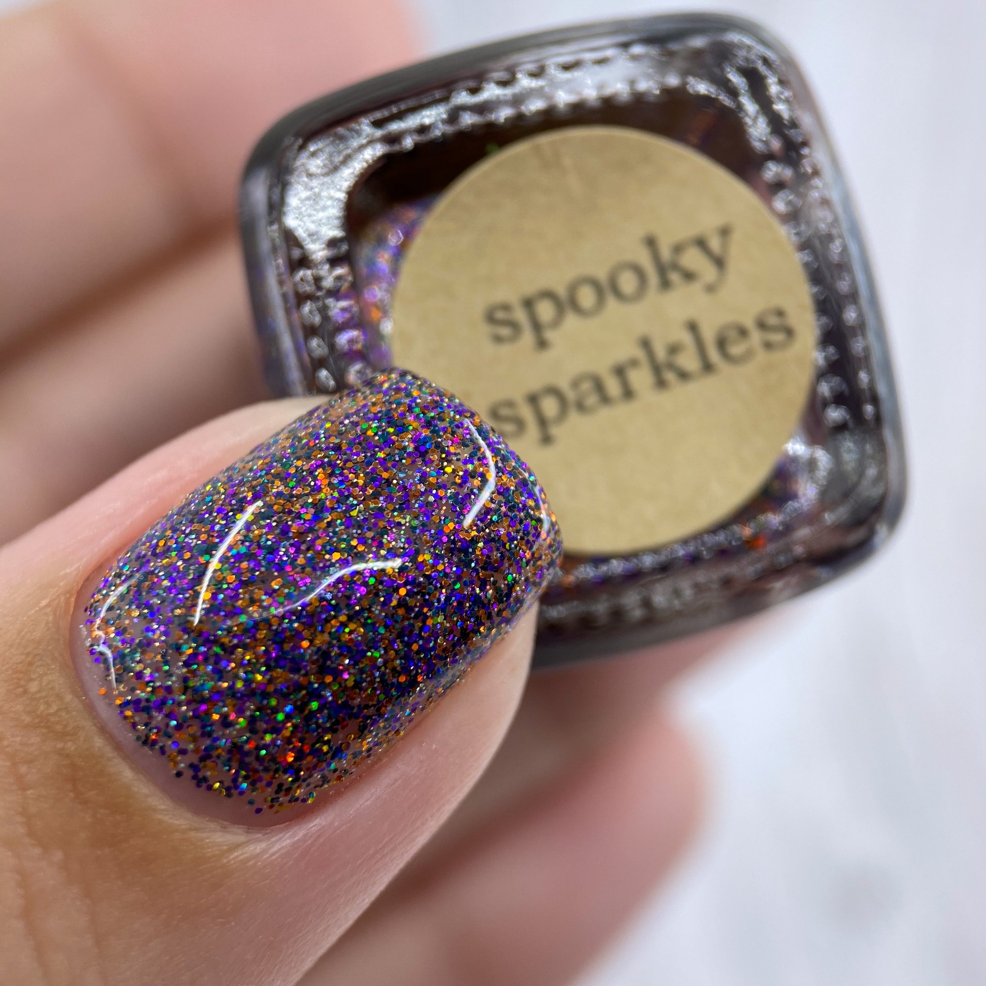 Spooky Sparkles is a Halloween themed black, purple, and orange holo full coverage micro glitter. Can be used in 1 coat as a topper or built up to full coverage in 2-3 coats.