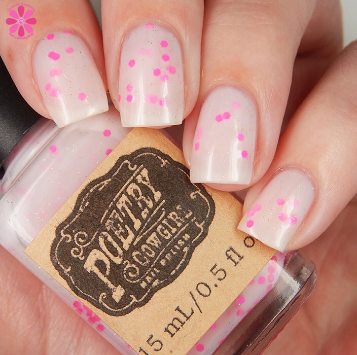 Strawberry Fizz is a semi-sheer white crelly with gold micro glitters and larger matte neon pink glitters. Can be built up for full coverage or layered over your favorite base color!